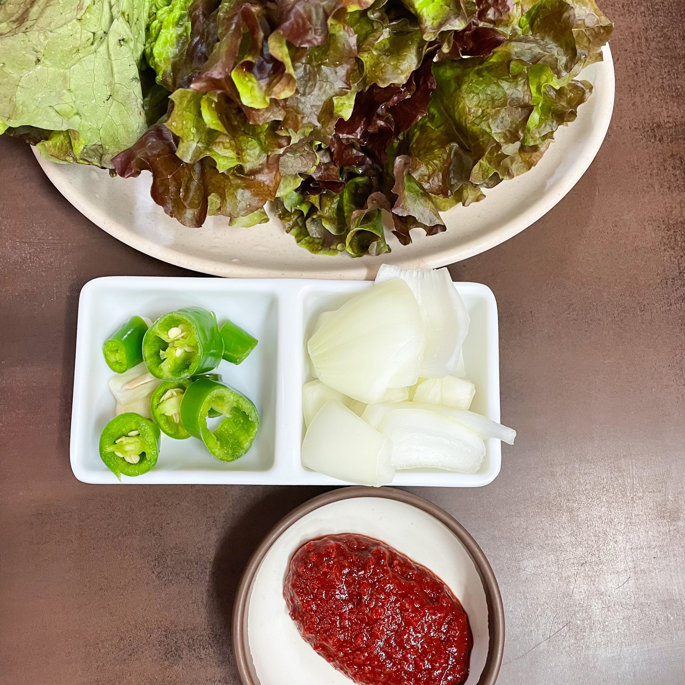 기본찬으로는 상추, 고추, 마늘, 양파,